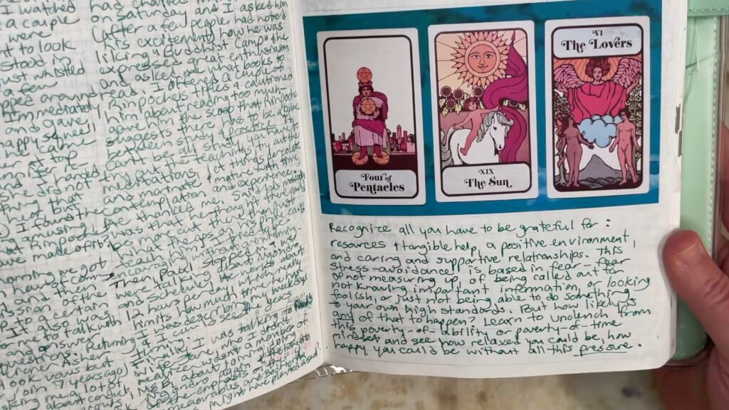 Another essential tool for this is my journal. I find that thinking through a situation or problem at the speed of hand-writing (which is for me, very slow) helps me look at everything more objectively. I’ll write a sentence, and then read it back to myself. Do I really think that? Do I believe what I think? What else does this one thought imply? What’s underneath it? All of these questions are easier to answer, I find, when we can take a look at the thoughts and emotions written out in front of us. Keeping them inside our head can keep us spinning around on the same track, or stuck in a tangle of half-truths. One of my teachers, Pema Chödrön, often talks about “ventilating” a problem. We have to acknowledge it, breathe some air and space into it, and be willing to just witness it before we try to “fix” anything. This is what journaling (and reading the cards) helps me do.