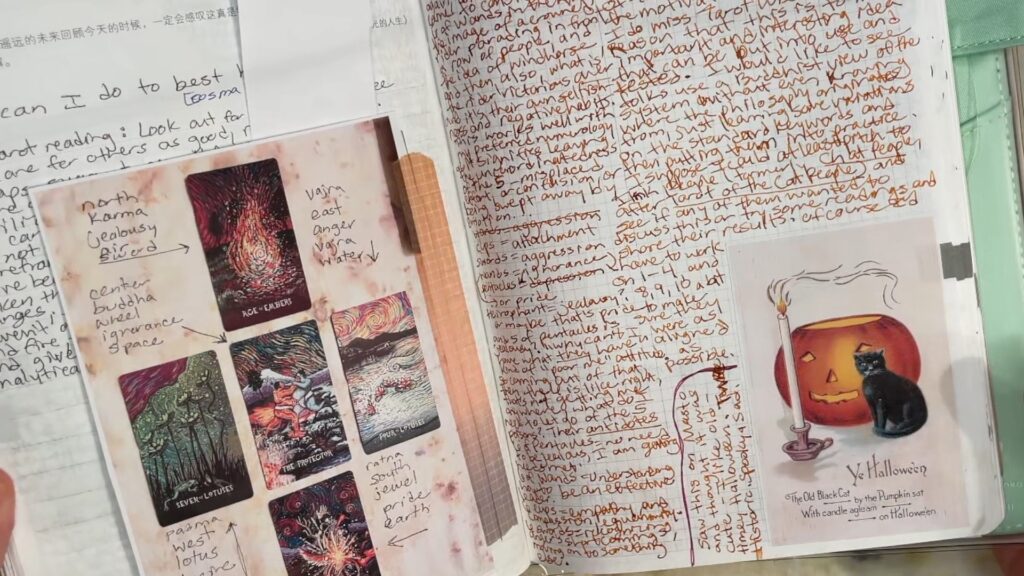 I have tried journaling off and on for years. It never stuck before, and I understand now that’s because I was being too limiting with myself. I was trying to keep a “farmer’s almanac” style journal, but that got repetitive (with an office job, a stable partnership, and no children, life isn’t always variable in the day-to-day). I don’t always want to do a deep-dive into my emotions and fears. I don’t always have time for elaborate scrapbook pages. I don’t typically want to keep to-do lists, but sometimes it’s fun to see what I was up to on a particularly busy week. I like to record my tarot readings, but I don’t read every day. I enjoy writing about our travels but we usually only have one or two trips per year.